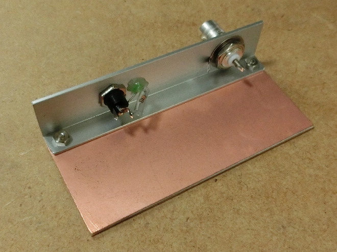 まとめるために、写真7のようにアルミLアングルをカットし生基板をネジ止めしました。ここに基板を固定する事になります。一応SGにしましたのでポリバリコンは付けていません。その端子には20pF程度を付けています。VXOにする場合はポリバリコンとツマミを用意する必要があります。もちろん、それなりのスペースも必要になります。