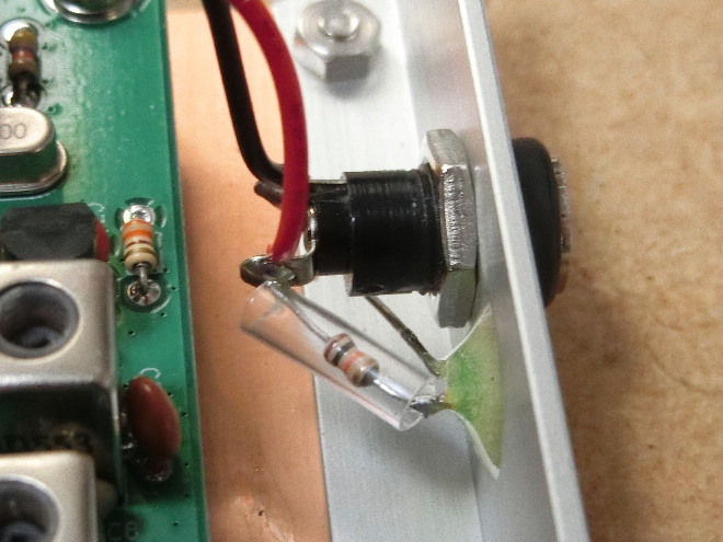 一応ですが、電源の切り忘れ防止のためにLEDを点灯させています。基板外なので図1にはありませんが、10kΩをLEDに直列に入れています。写真8のようにエポキシ系の接着剤でLEDを固定し、電源コネクタから配線しました。電源スイッチを入れるほどでもないので、省略しました。