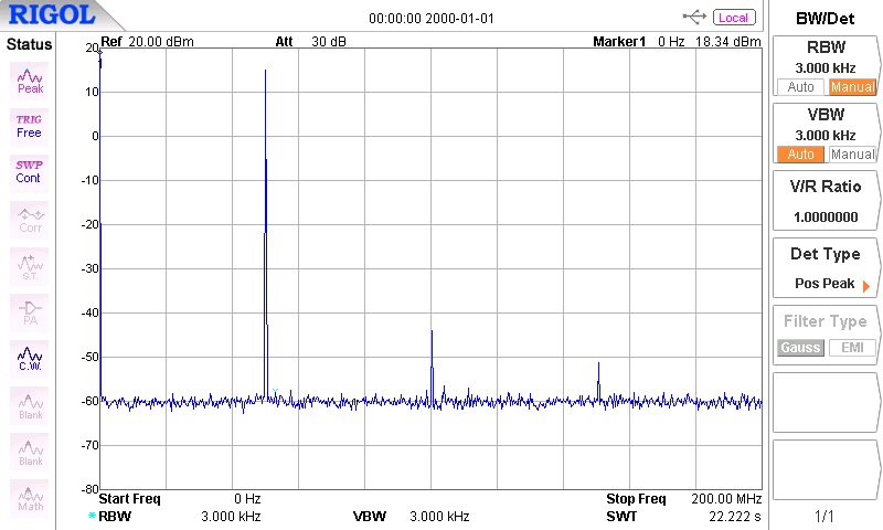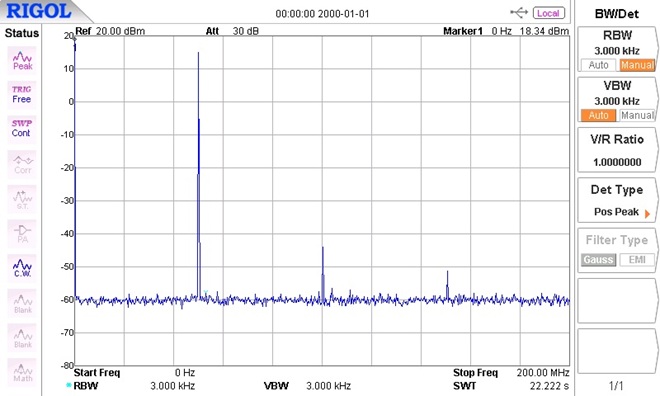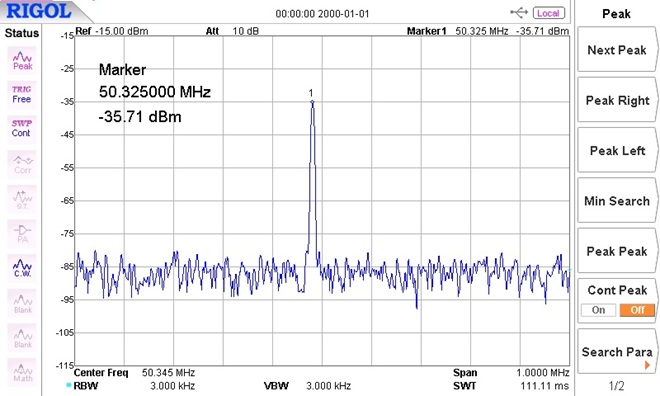 最初にSGではなく、出力を直結してスペアナで測ったのが測定結果1になります。このように、一番問題となりそうな2倍波と4倍波は見えません。本来は6倍波になる100MHzで-60dBcですので問題ないでしょう。出力レベルとしては+14.7dBmでした。接続先はトランスバータ基板のDBMですので、3dBのアッテネータを入れても十分なレベルです。出力は39MHzではありませんが、同じような結果になるはずです。