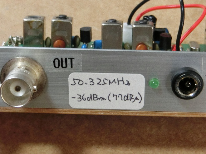 このように出力は-35.71dBmとなりましたので、受信機の調整等に簡易SGとして使用する事ができそうです。SGとしては、もう少しレベルが低い方が使いやすいと思います。周波数と共にレベルを四捨五入して、写真9のようにメモを貼っておきました。この出力は調整の状態や、少しの位置関係によって変わります。必ずこの値になるという事ではありません。ですから作業の時に変化しても良いようにメモをしました。