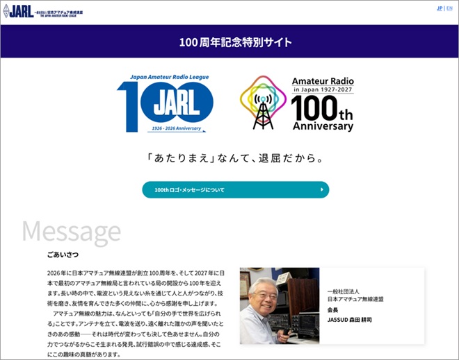 今年(2026年)はJARLの創立100周年、来年(2027年)は日本のアマチュア無線が100周年を迎えることから、JARLではさまざまな記念企画を用意し、特設サイト(https://100th.jarl.org/)で案内を行っている。
