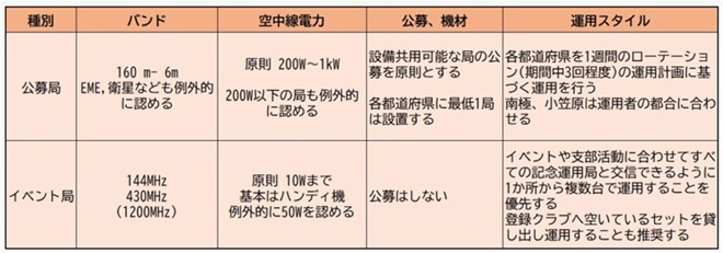 公募局は主に固定局(160m~6mだがEMEや衛星なども例外的に認める、出力は原則200W~1kW)で、各都道府県を1週間のローテーション(期間中3回程度)の運用計画に基づく運用を行う(ただし南極と小笠原は運用者の都合に合わせる)というもので、2026年1月末まで募集が行われた。またイベント局は、イベント会場から144/430MHz帯(1200MHz帯)で原則10Wまで。基本はハンディ機での運用を想定している。