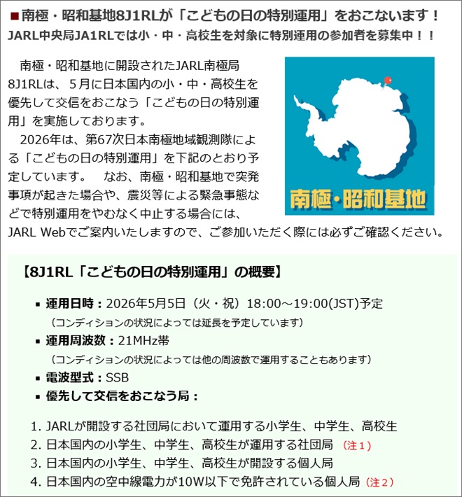 南極の昭和基地に開設しているJARL局「8J1RL」は、毎年5月に日本の小・中・高校生と優先交信を行う「こどもの日の特別運用」を実施している。2026年も5月5日(火・祝)の「こどもの日」に第67次日本南極地域観測隊(越冬隊)が担当し、特別運用が行われることをJARLが発表した。