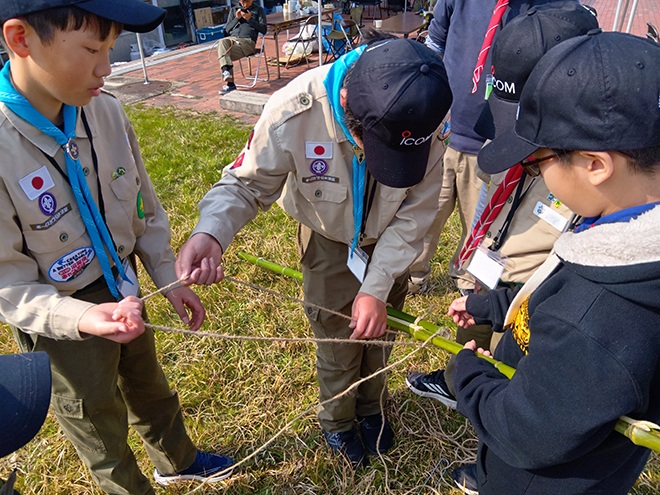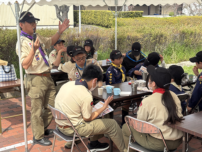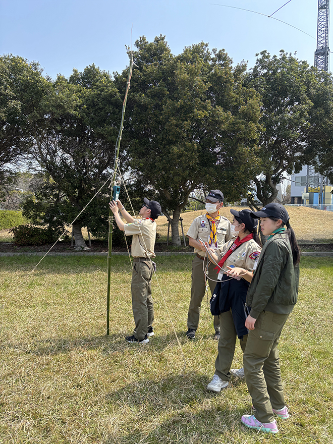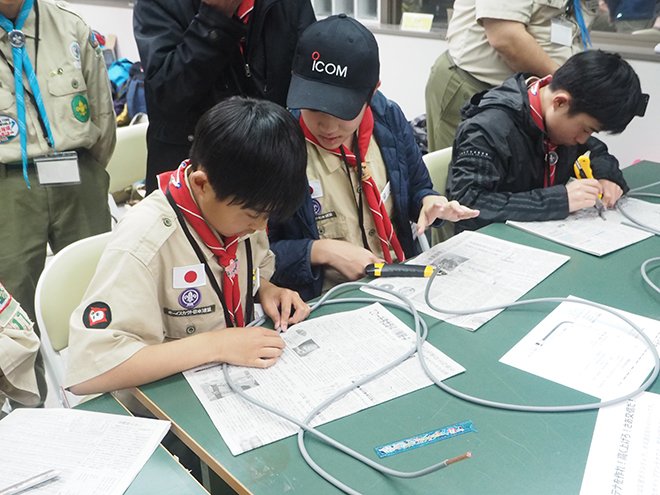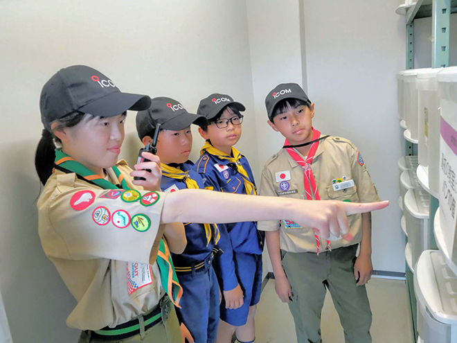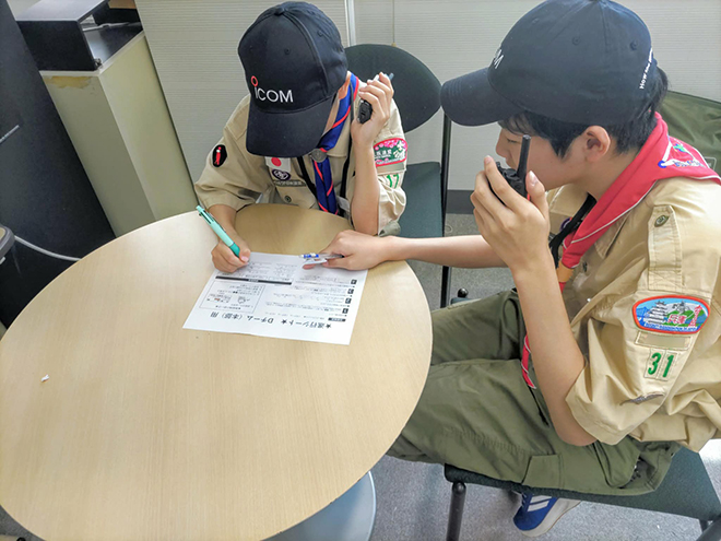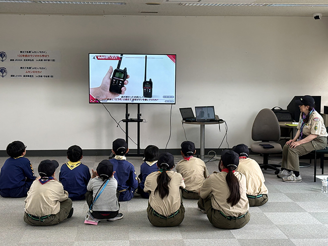 アイコム株式会社がトランシーバーを使った防災教育用に企画したプログラムに、スカウト要素を付け加え行った。説明ではスマートフォンとトランシーバーの違いや、災害時におけるトランシーバーの優位性、操作の仕方などをまとめた動画を視聴し、複数のグループに分かれ、トランシーバーを使って情報のやり取りを行った。