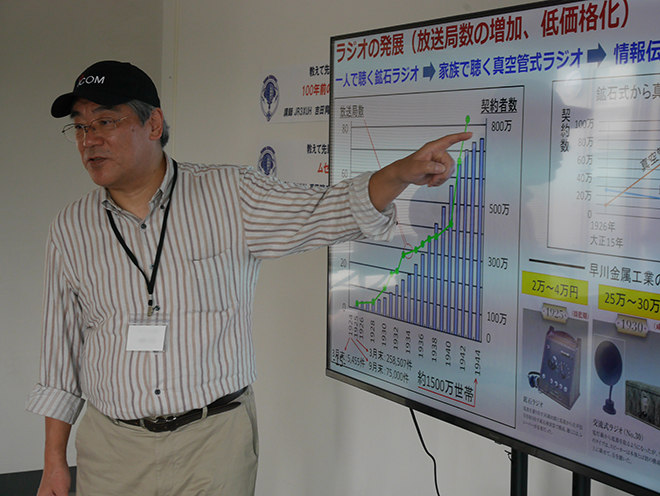 吉田氏が所属するシャープ社友会 ラジオ愛好者同好会の「国産第1号鉱石ラジオの複製プロジェクト」で複製されたラジオや、修復に成功した1931年製の真空管ラジオの修復作業が解説され、その後実際に視聴が行われた。