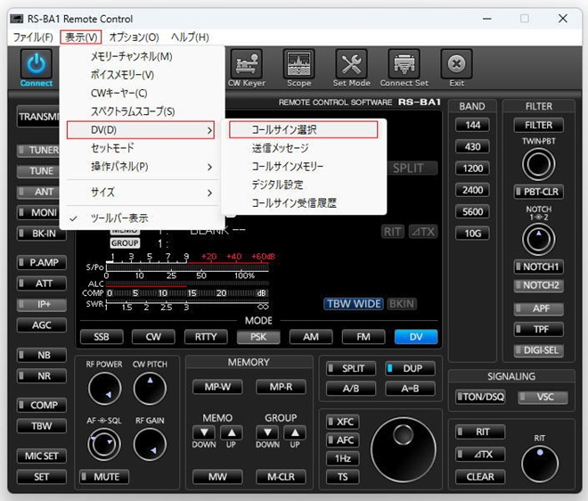 RS-BA1のメニューから[表示(V)]>[DV(D)]>[コールサイン選択]をクリックし、「コールサイン選択」画面を呼び出すと、ID-1時代のような懐かしい画面が表示されます。