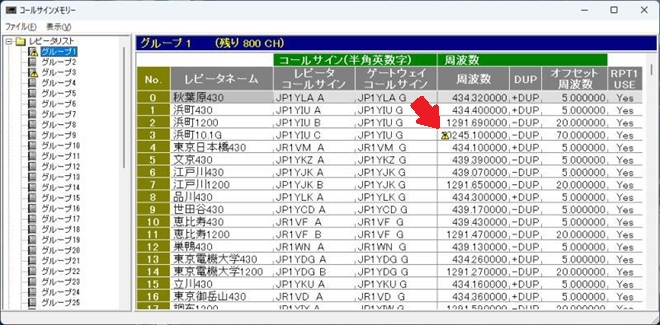 ただし、接続した無線機の仕様により、運用できない周波数帯のレピータ(例: IC-9700接続時の10GHz帯レピータなど)には、リスト上で「!」マークが表示されます。これらは[RPT1]に設定しても運用できませんので注意してください。