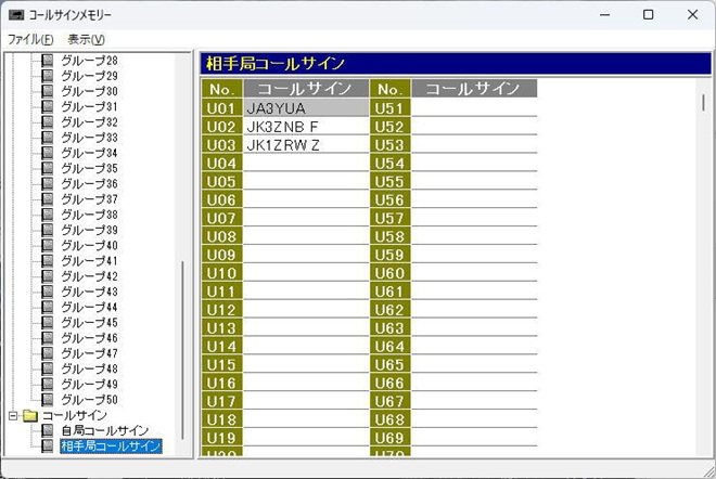 操作は「コールサインメモリー」画面で行います。画面左側の「グループ」ツリーの下部に、自局コールサインと相手局コールサインを登録・管理できる項目があります。ここに馴染みの局などを登録しておけば、複雑なコールサインを手入力する手間が省け、よりスムーズな運用が可能になります。