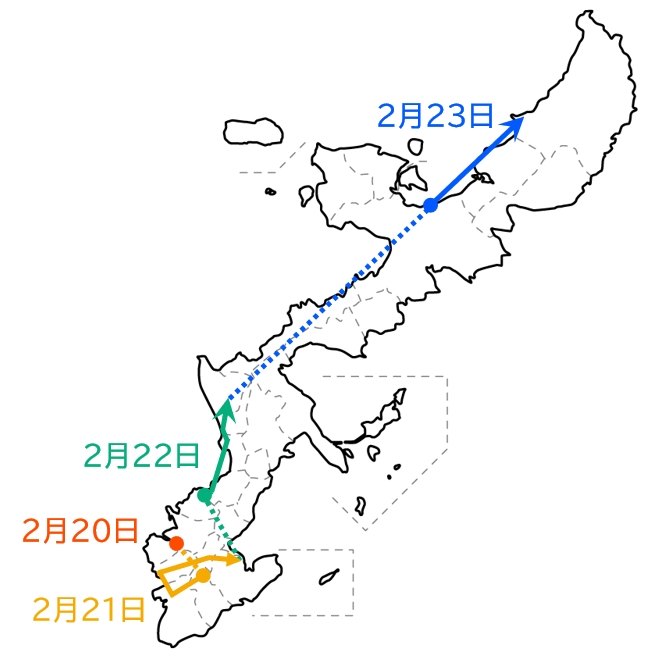 2月の沖縄本島移動は、2025年(2025年4月の記事)に続いて2年連続となりました。沖縄本島は25の市町村があり移動に時間がかかる地域もあるため、連休を利用して効率よく巡回したいと考えました。この時期は西日本でも雪の影響を受ける可能性がある一方で、沖縄は台風シーズンではなく気候が比較的安定していることも大きな理由です。